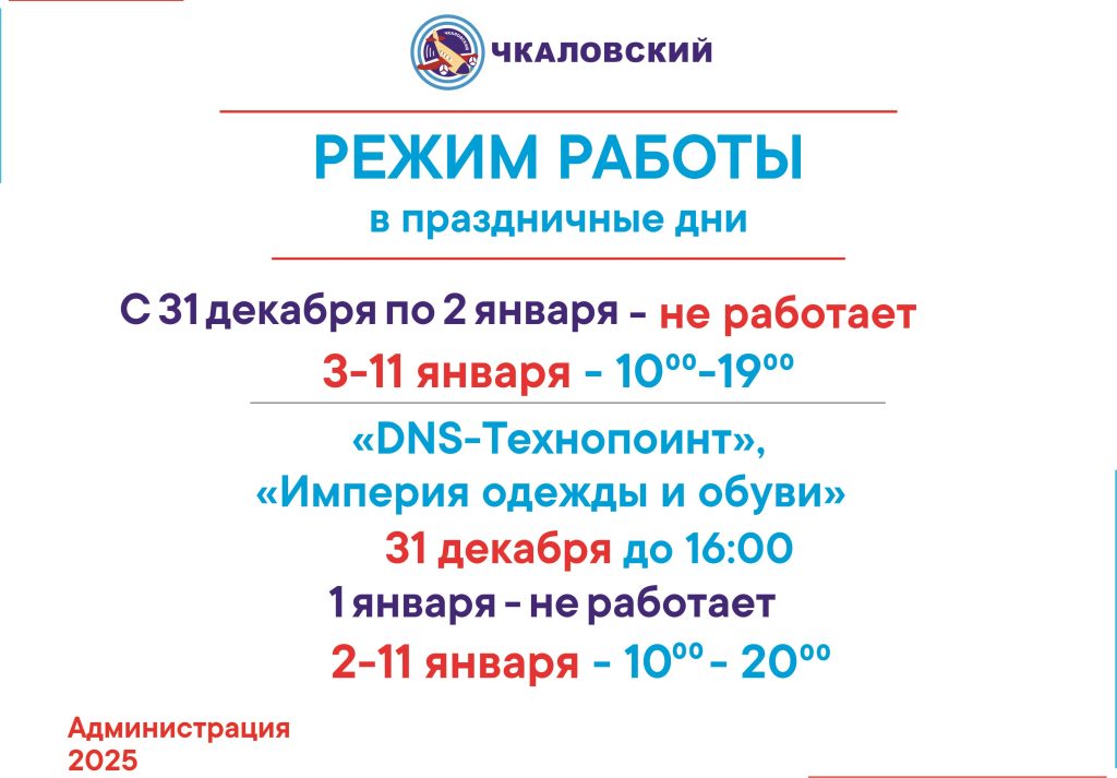 с 3 по 11 января 2026 г. — ТЦ Чкаловский работает с 10-00 до 19-00 ч.